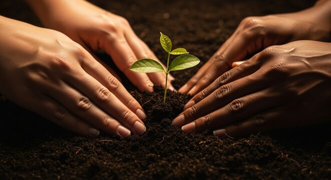 Close-up of diverse hands planting a young seedling in soil, depicting global environmental conservation, sustainable development, and ecological stewardship