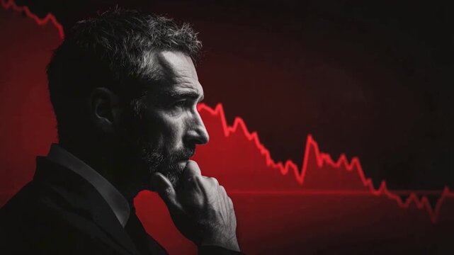 Economic Downturn: A pensive individual, lost in thought, is set against a stark backdrop depicting financial downturn.