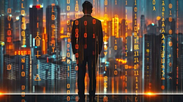 A businessman using contemporary city money and a stock chart backdrop for a foresightful future financial property index investment banking idea