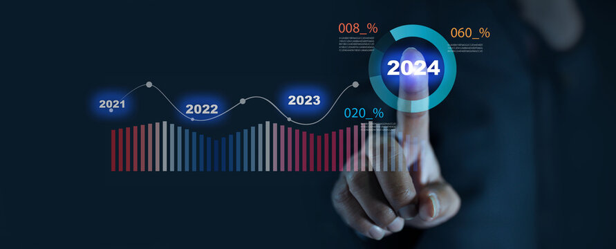 Hands touching on virtual graph corporate future growth year 2023 to 2024.