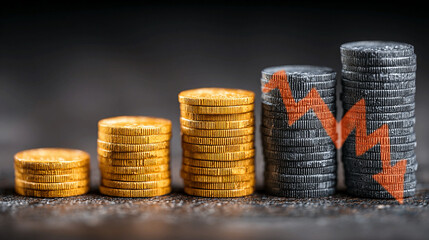Illustrated bar graph with downward trend arrow depicting economic decline