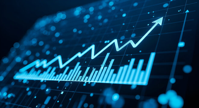 Blue digital financial chart with an upward-sloping line and bars, symbolizing economic growth, investment and modern market analysis, positive results, investment strategies, and economic evolution.