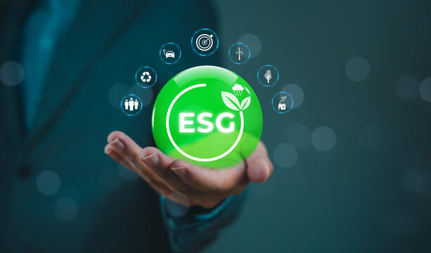 ESG, Environmental, Social and Corporate Governance, company responsibility to care world environment and people concept, business people touch light bulb with seedling green plant and governance gear