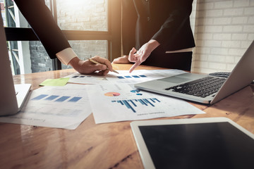 Economic business discussions, Business team analyzing income charts and graphs to plan marketing concept with using computer laptop and tablet for analysis.