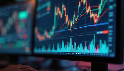 Close-up view of computer screen displaying detailed data points, statistical models. Business analysts at work, charts, graphs. Modern financial analysis in process. Stock market trading interface.
