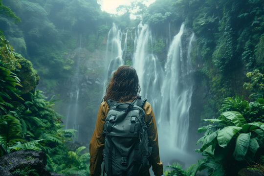 A traveler hiking through lush green forests to discover hidden waterfalls. A woman with a backpack stands by a jungle waterfall