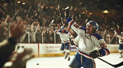 Ecstatic hockey player celebrating a goal with arms raised in a packed arena.