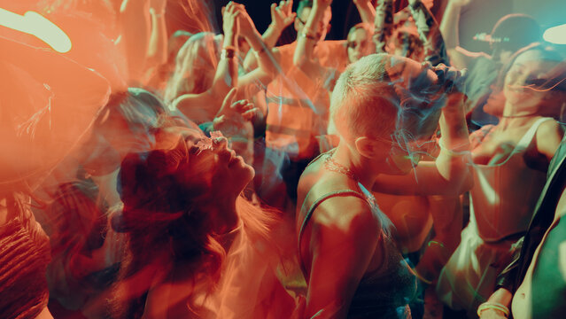 Blurred image of dancing crowd at a vibrant, colorful nightclub party, in a dimly lit, smoke-filled club with vibrant red and orange lighting. Concept of party, youth, nightclub, celebration.