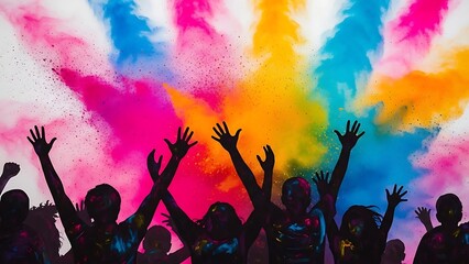 Vibrant celebration with colorful smoke and silhouetted crowd