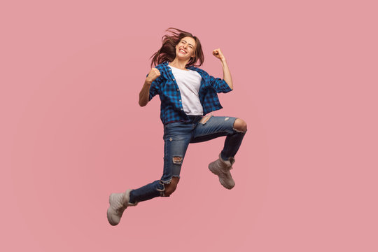 Full length of overjoyed ecstatic stylish girl jumping in air, gesturing i did it, celebrating success, flying and rejoicing her dream achievement. indoor studio shot isolated on pink background