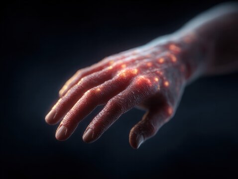 Close up of human hand with glowing inflamed spots and cracked skin texture representing severe skin irritation or infection