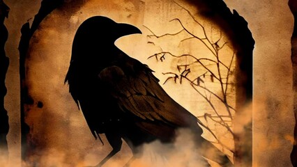 Poe's raven animated fog blackbird, crow, poetic moody dark emo misty, creepy dirty aesthetic, shadowbox noir style spooky, grime, grimy, gritty, organic dirt cracked (generative AI, AI)