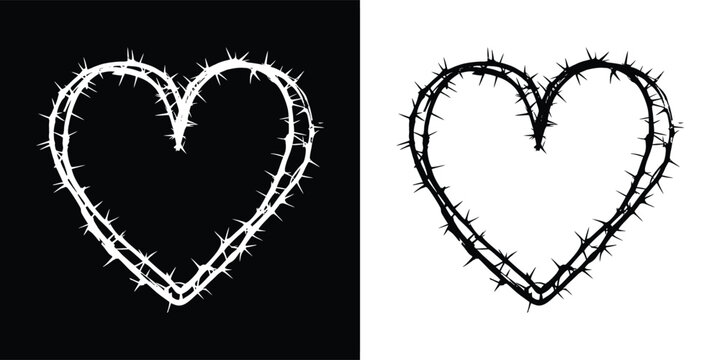 Barbed wire heart shape illustration in black and white, symbolizing love, pain, and emotional struggle with a grunge aesthetic