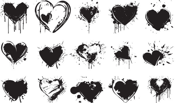 Set of grunge black graffiti heart vector illustrations with splatter and drip effects, ideal for edgy street art, punk designs, alternative fashion, or tattoo-inspired artwork.