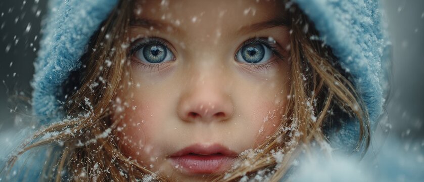 Captivated by winter: a child's heartfelt reaction to snow. Candid shot. Portrait of a child's first experience with snow, pure excitement in their eyes. Real life. Feature story.