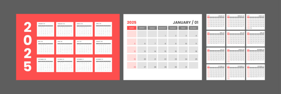 Calendar planner 2025 schedule month calender, organizer template. Week starts on Sunday. Business personal page. Modern simple vector illustration