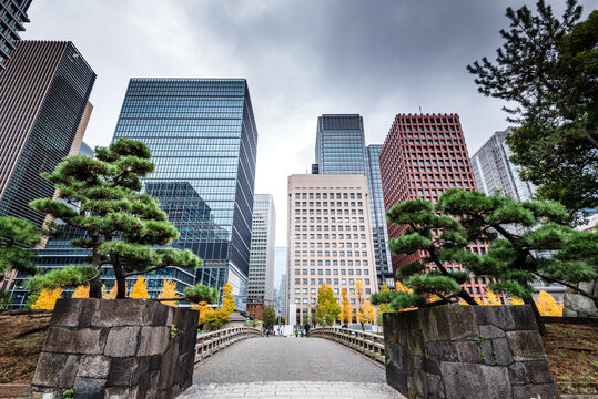 Old Edo Castle walls and skyscrapers on an overcast autumn day with yellow leaves in Fall, Tokyo, Honshu, Japan, Asia