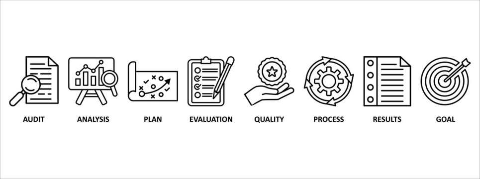 Assessment banner web icon vector illustration for accreditation and evaluation method on business and education with audit, analysis, plan, evaluation, quality, process, results and goal icon