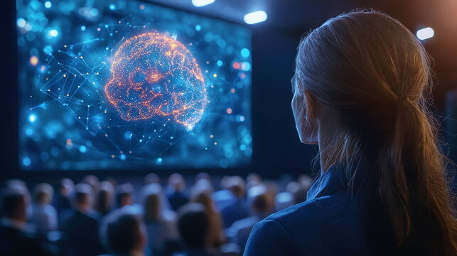 Digital brain visualization on large screen with audience in dark auditorium, representing technology, neuroscience, and cognitive re discoveries in modern society.