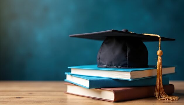 Graduation cap atop a stack of books, symbolizing education and academic achievement. A timeless image representing the culmination of learning and the pursuit of knowledge.