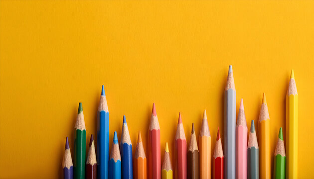 A row of colorful pencils arranged neatly against a vivid yellow background, conveying creativity and organization. Perfect for education and art-themed projects.