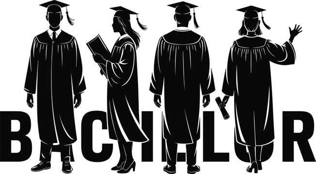 Bachelor graduation silhouette illustration with diverse poses and academic caps for degree celebration and educational achievement themes.