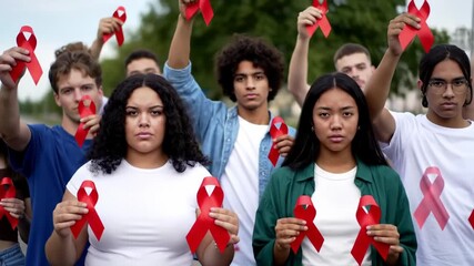 Group of people raising red ribbons outdoors, advocating HIV/AIDS awareness, for media