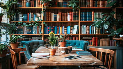 A cozy library setting adorned with lush green plants, wooden furniture, a bookshelf filled with books, and a peaceful ambiance for reading and study.