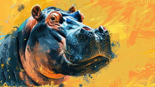 A detailed view of a hippo on a vibrant yellow backdrop. Ideal for educational materials or wildlife-themed designs