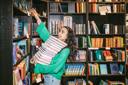 Girl with heap of books reaching at shelf while standing in bookstore