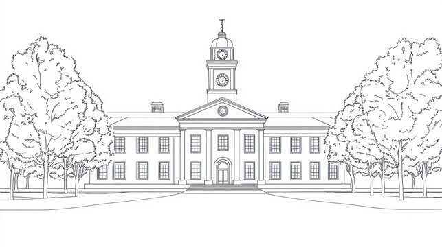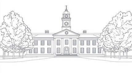 Outlined Classic College Building, Trees, Front View.  Possible Use Educational Stock Photo