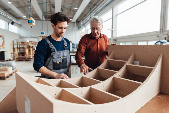 Senior businessman having discussion with carpenter in workshop