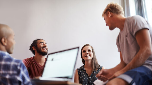 Students, group and laptop with screen, discussion and learning for education and study. People, technology and books with classroom, diversity and conversation for future development or research