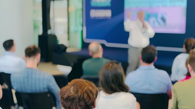 Crowded Conference Hall Audience Watches Large Screen Presentation During Business Event