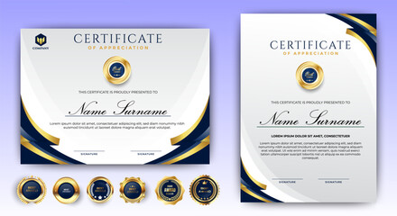 Certificate of appreciation template, gold and blue color. Clean modern certificate with gold badge. Certificate border template with luxury and modern line pattern. Diploma vector template.