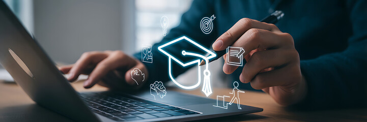 Man using laptop with education and learning icons online course, elearning, study, graduation, knowledge, certificate, and skill development concept