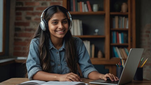 Smiling millennial indian girl in headphones read textbook study watching webinar on laptop, happy smart ethnic female student prepare for test with book and computer, take distant educational course