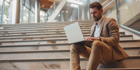 Happy smiling students with backpacks hold laptop and book on college campus. Focus on technology, learning and skill development. Friends share knowledge and experience for future success.