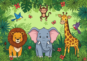 Adorable jungle animals including a lion, elephant, giraffe, monkey, and birds create a vibrant, whimsical scene perfect for children's educational content and playful designs.