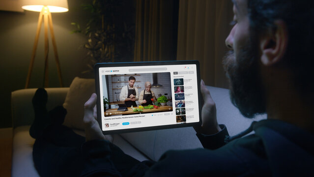 Man watches a cooking tutorial on a tablet while laying on sofa in the living room. Modern digital learning and the convenience of accessing educational content online from home.