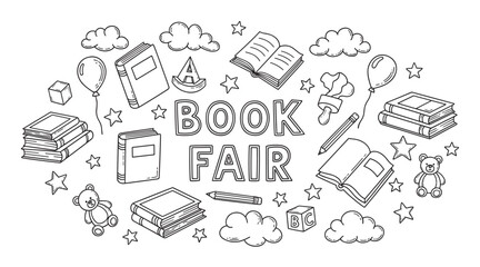 Book fair doodle set with lettering and cute educational elements. Hand drawn collection of books, toys, and school supplies for a kids' reading event or festival banner