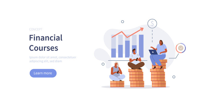 Characters studying finance with tutor in business school or courses. People learning how to manage finances. Financial and business education concept. Flat cartoon vector illustration.