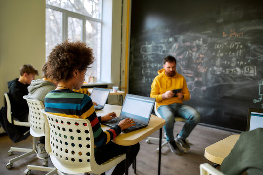 Educating Students For Success In A Changing World. Portrait of pupils listening to their tutor, while sitting with laptops during a lesson in modern smart school. Selective focus