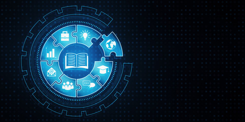 Creative digital round puzzle educational hologram on dark blue background. Microlearning and gamification concept. 3D Rendering.