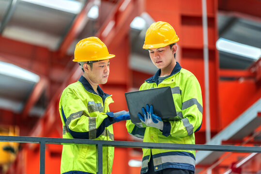 Two male construction workers wea yellow safety helmets and high-visibility jackets discussing project details while working on a modern steel framework building site