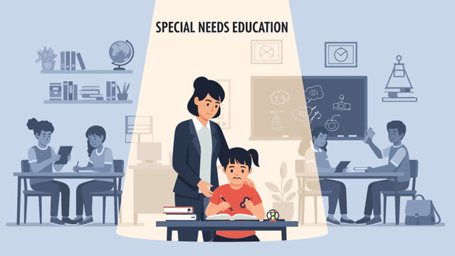 A supportive teacher guides a young male student at the chalkboard, illustrating the concept of mentorship and primary education