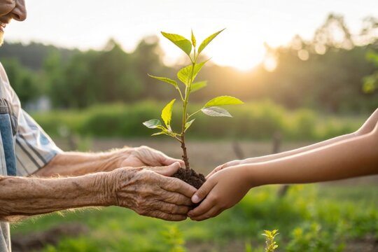 Father reading book to son outdoors, sunset glow, family bonding, education