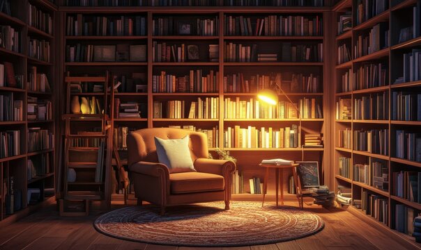 Cozy library corner with wooden bookshelves, warm lighting, and a comfortable armchair, inviting a moment of quiet reflection.