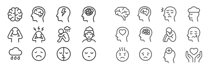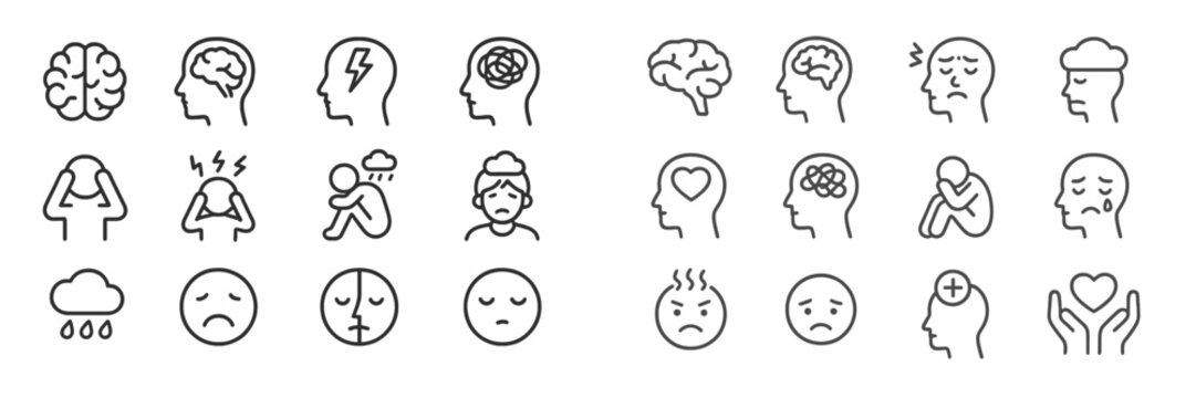 Various icons representing different human emotions and mental states depicted in a simple, monochromatic style for educational purposes