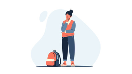 Contemplative young woman with backpack in casual attire, thinking about travel or studies